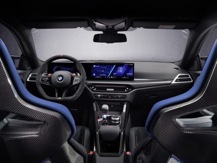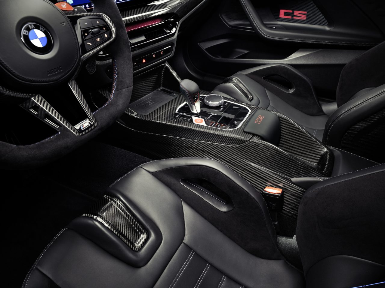 No interior, o modelo conta com acabamento exclusivo CS em fibra de carbono, revestimento em couro Merino na cor Preto com Detalhes M Performance, e um volante M em Alcântara com marcação do 12 horas ao centro.