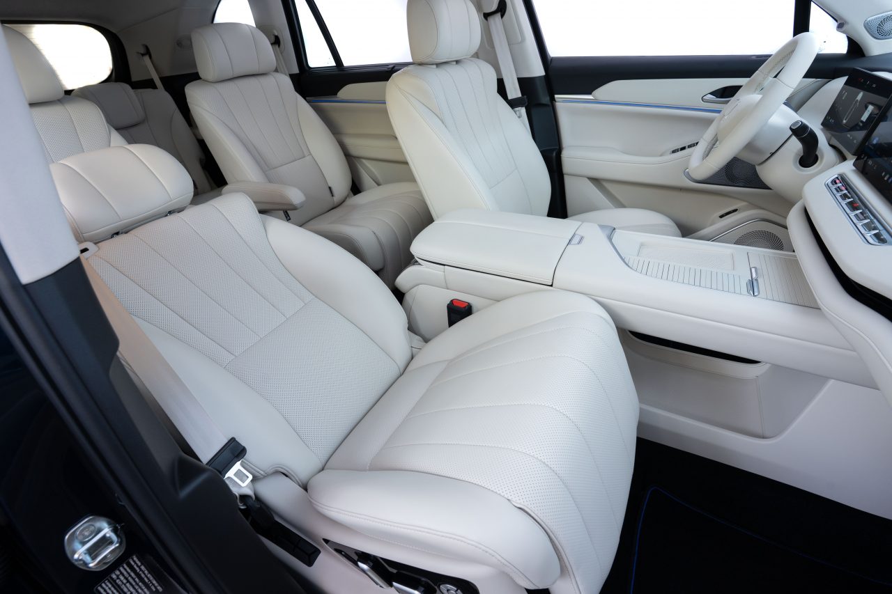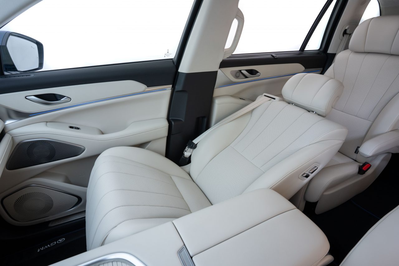 A segunda fileira possui 10 ajustes elétricos, apoios de pernas e lombar, dois modos de massagem, ventilação e aquecimento independentes.