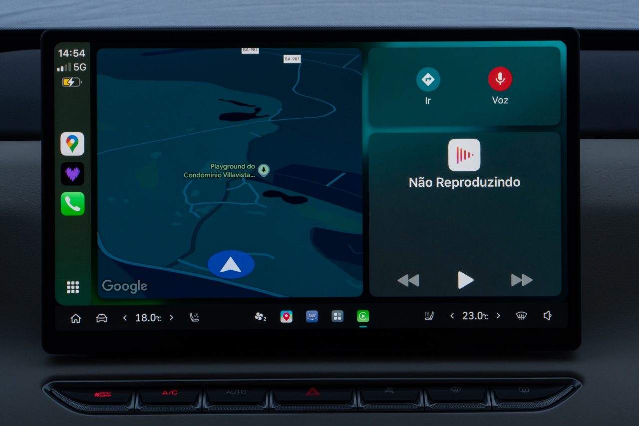 O sistema é compatível com Apple CarPlay e Android Auto sem fio, permite personalização da interface e comandos de voz em português.