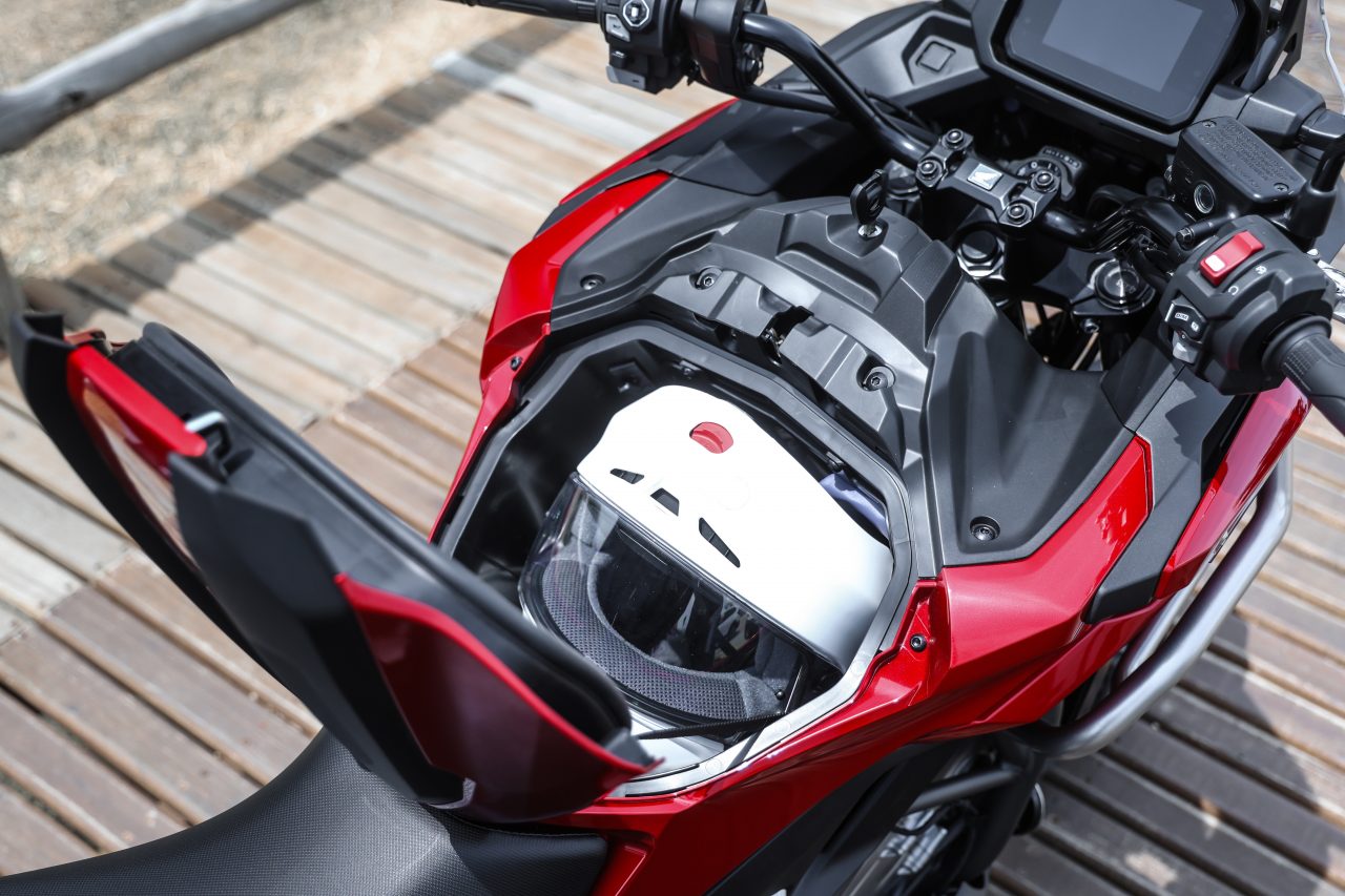 O prático compartimento de carga frontal (onde ficaria o tanque), com 23 litros de capacidade para abrigar um capacete integral e itens pequenos, permanece como “assinatura” do modelo.