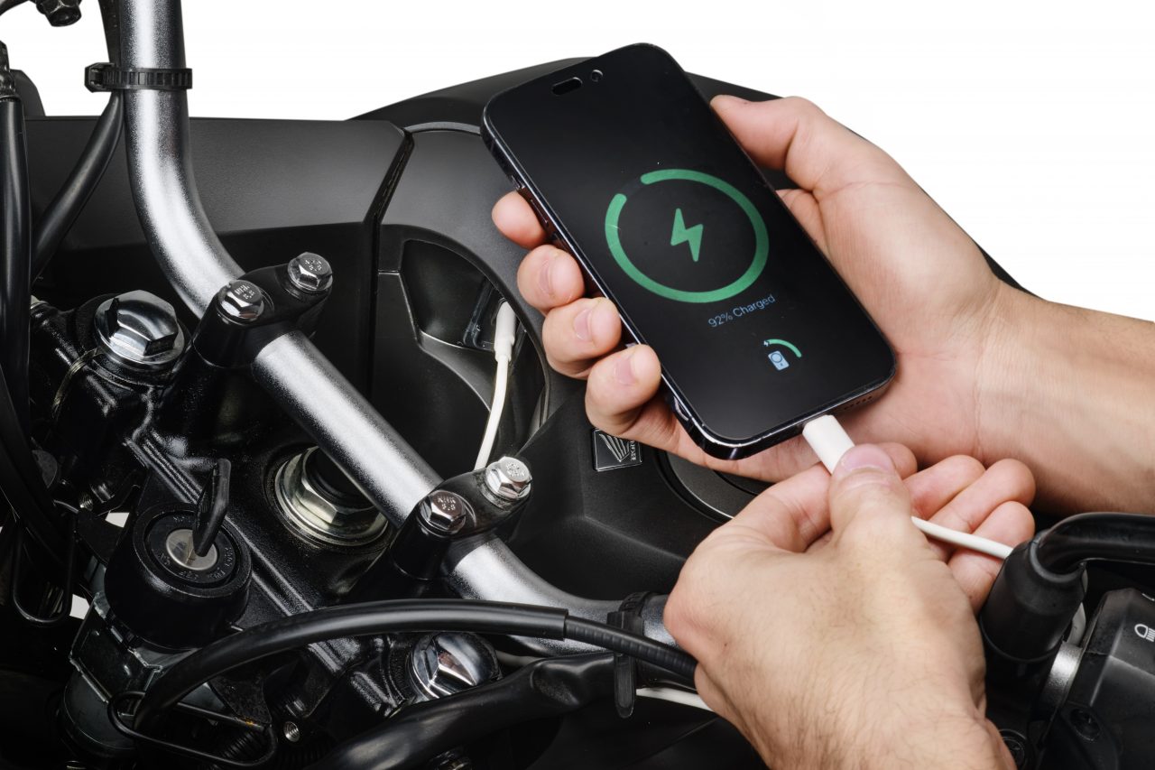 Outro elemento de modernidade mantido é a porta USB-C, de série, que oferece praticidade para o carregamento de dispositivos móveis, um diferencial importante para o motociclista de uso diário.
