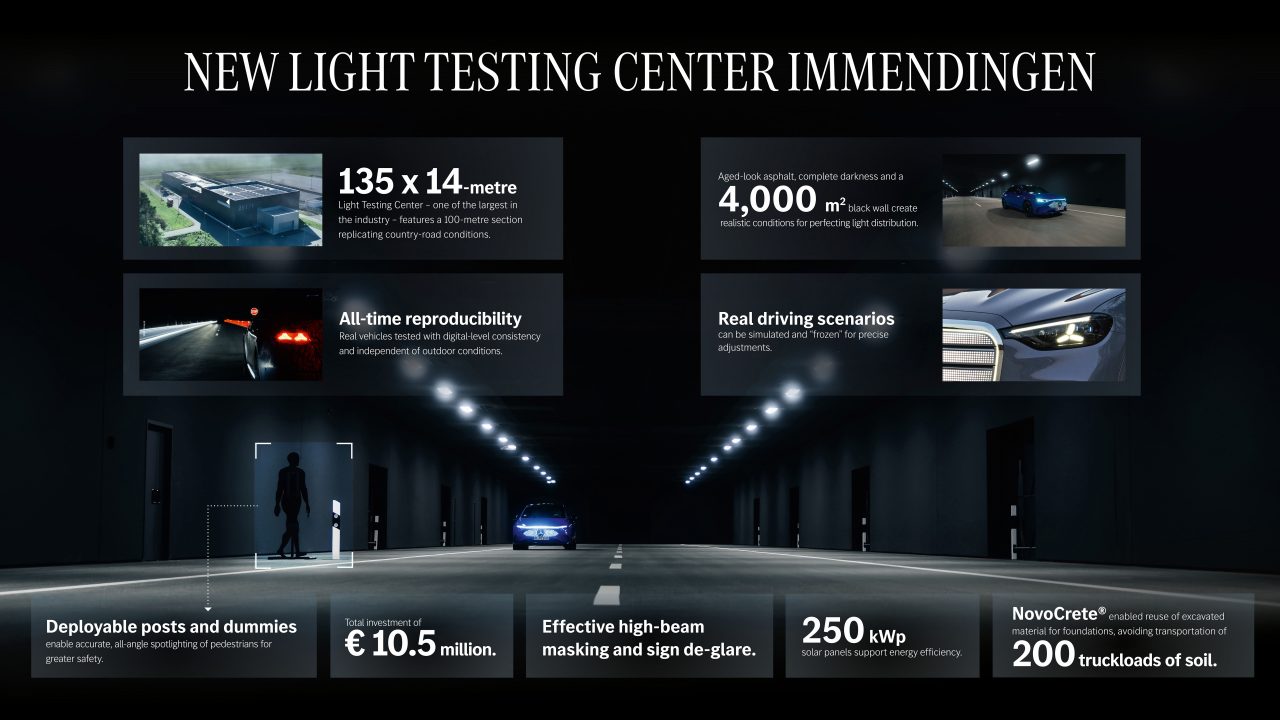 A Mercedes-Benz expandiu a capacidade de seu Centro de Testes Global de Immendingen com a inauguração do centro de testes de iluminação mais avançado da indústria automotiva. O novo módulo, que custou 10,5 milhões de euros e demorou dois anos para ser construído, é um dos maiores do mundo e permite a replicação fiel de uma estrada rural para testar sistemas de faróis em condições constantes e controladas, elevando a precisão no desenvolvimento de veículos.
