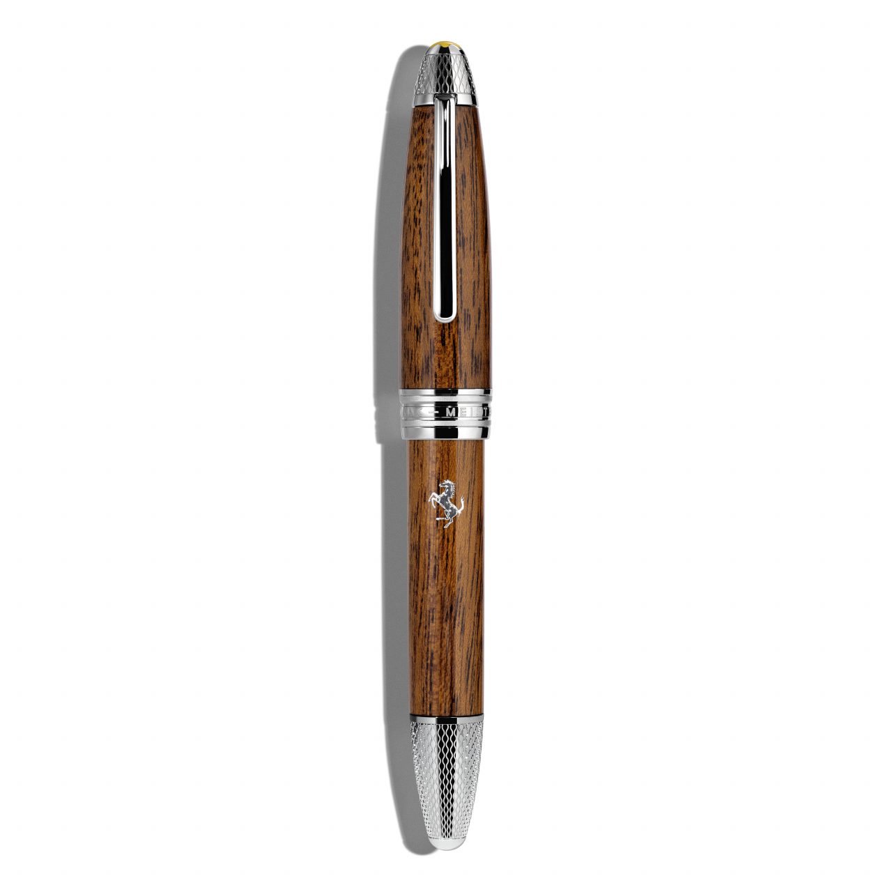 O emblema Montblanc mantém sua posição tradicional na tampa, e sua cor amarela é uma homenagem a Modena, na Itália, berço da lenda da Ferrari.
