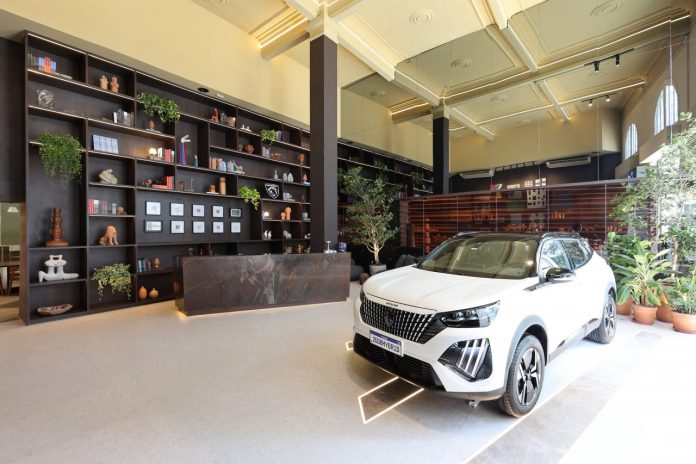 O ícone da marca, o Leão, é o ponto central do conceito arquitetônico, aparecendo no piso do ambiente representado por suas garras e em esculturas que reforçam a imponência e identidade da Peugeot.