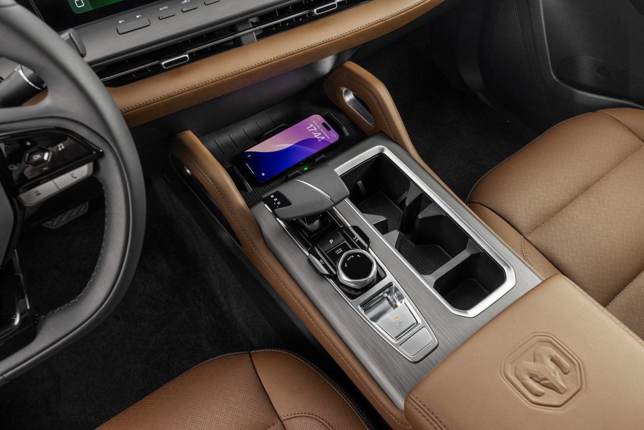 Por dentro, a Dakota Laramie replica a atmosfera premium presente nas picapes maiores da marca. O interior traz bancos em couro marrom premium, materiais macios ao toque e acabamento sofisticado nos painéis. O console central é dividido em dois níveis, oferecendo porta-copos, ampla área de armazenamento, comandos integrados e portas USB/USB-C, além de tomada 12V.