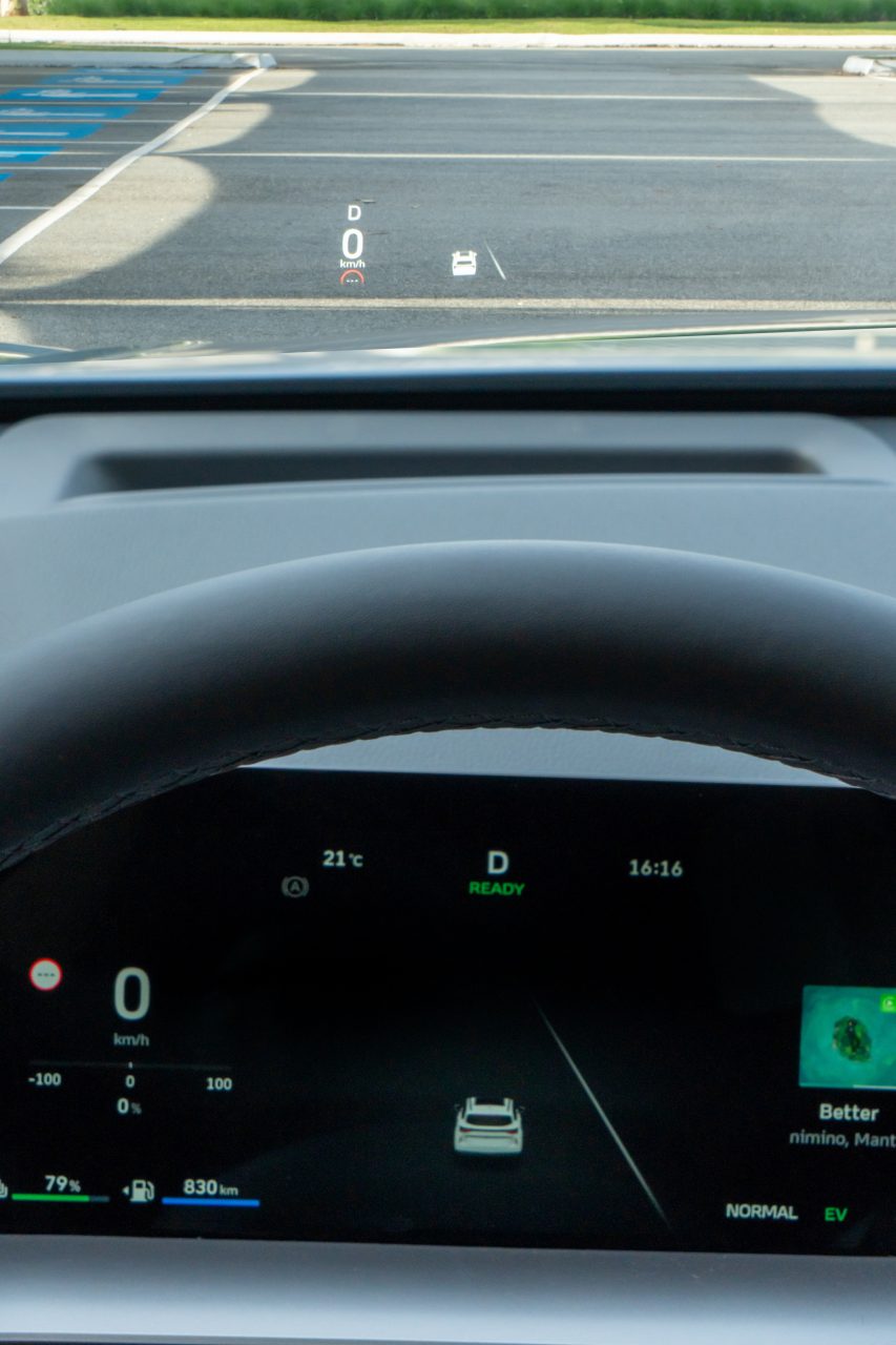 A transmissão híbrida DHT usa duas relações para equilibrar torque e eficiência. Isso permite transições suaves entre os modos elétrico, híbrido e 4WD, priorizando conforto e desempenho.