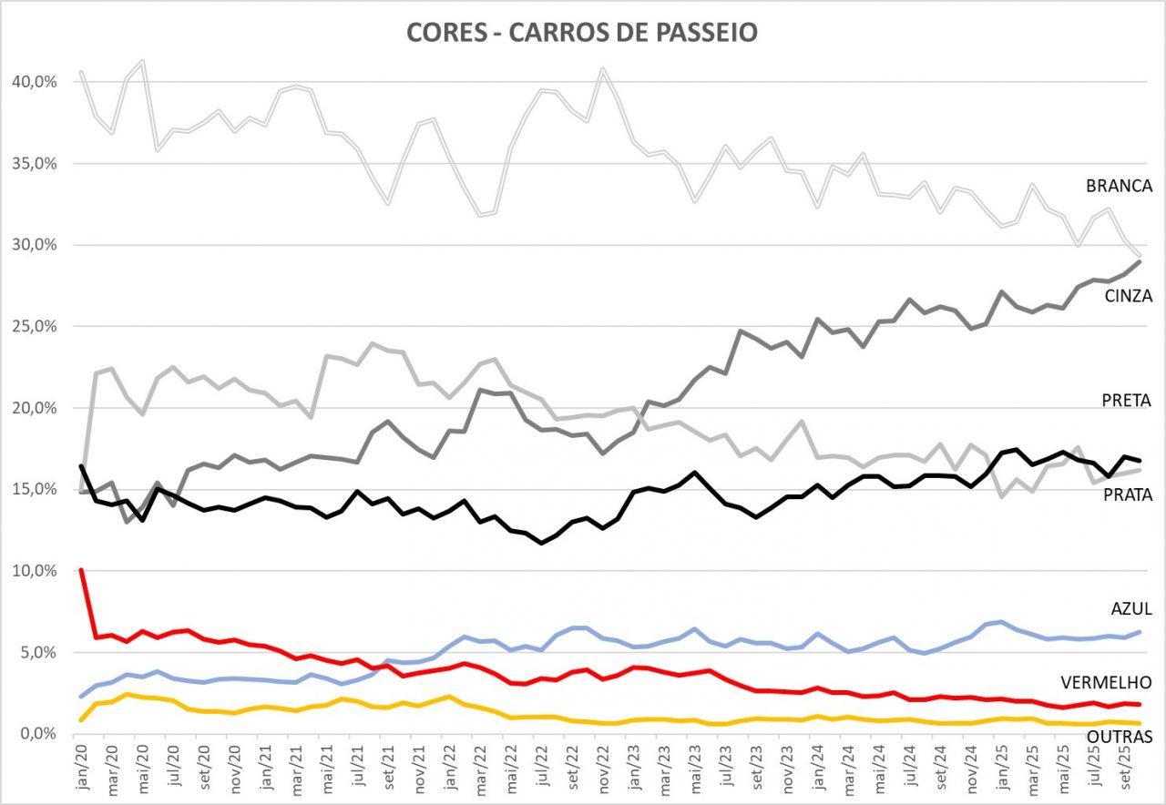 A K.LUME Consultoria divulgou um levantamento sobre a participação das principais cores na venda de veículos zero km no Brasil. O estudo mostra que o domínio da cor branca, líder absoluta desde 2012, está chegando ao fim. Em outubro de 2020, os carros brancos representavam 37% das vendas, mas em outubro de 2025 esse número caiu para 29%.
