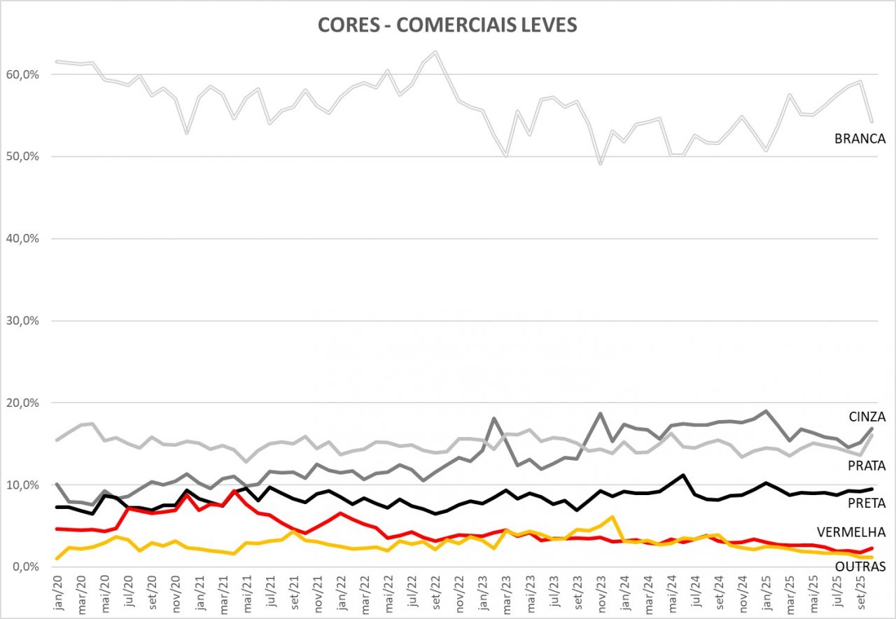 Nos comerciais leves, o comportamento é diferente. Segundo Máia Màrtins, sócia da K.LUME, esse segmento é voltado ao trabalho, com menor apelo emocional na escolha da cor. O branco continua líder absoluto, com 54,2% das vendas, embora tenha recuado em relação aos 58,3% registrados há cinco anos. A variação entre cores nesse segmento é bem menor, confirmando a predominância do branco.