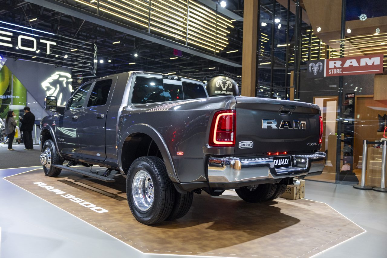 A Ram também apresentou dois modelos que ampliam o impacto visual e técnico no Salão. A 3500 Limited Longhorn Mega Cab Dually surge como a picape mais imponente da categoria, equipada com cabine ampliada e rodado duplo traseiro, capaz de transportar 2,4 toneladas e rebocar quase 15 toneladas — números superiores aos de rivais como Ford F-350 e Chevrolet Silverado HD no mercado norte-americano.
