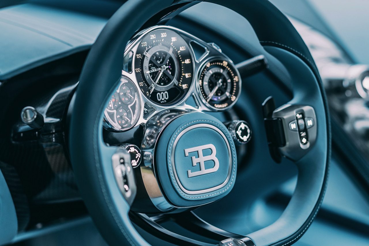 O volante de cubo fixo, com comandos integrados e borboletas de câmbio, gira livremente ao redor do airbag central, representando uma proeza mecânica. O painel de instrumentos, totalmente analógico, foi desenvolvido em parceria com mestres relojoeiros suíços, destacando engrenagens e mecanismos visíveis em caixas de alumínio fresado e visores de cristal, remetendo à simplicidade mecânica dos Bugatti do início do século XX.