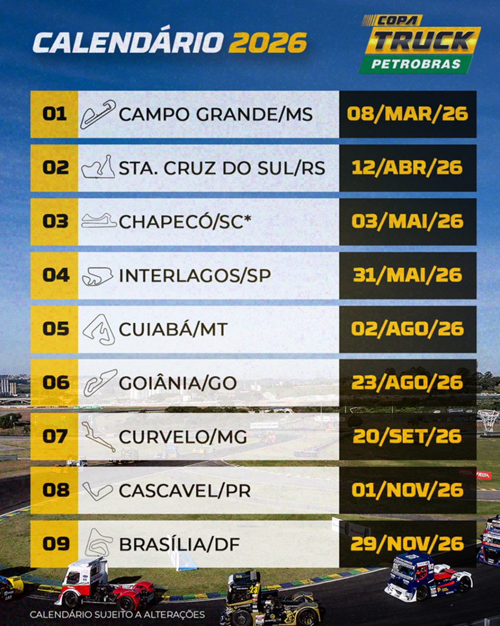 O calendário 2026 já está definido com nove etapas entre março e novembro, passando por nove estados diferentes, incluindo estreias em Chapecó, Cuiabá e Brasília, além do retorno a Santa Cruz do Sul e Goiânia. Interlagos segue em maio como etapa tradicional.