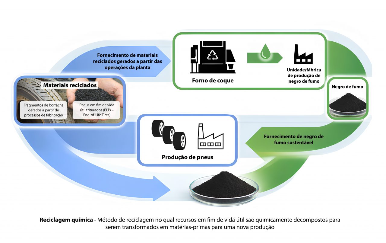 Negro de fumo – Material derivado da combustão incompleta de hidrocarbonetos, usado para reforçar a borracha dos pneus. No processo sustentável, é obtido por reciclagem química de pneus usados.