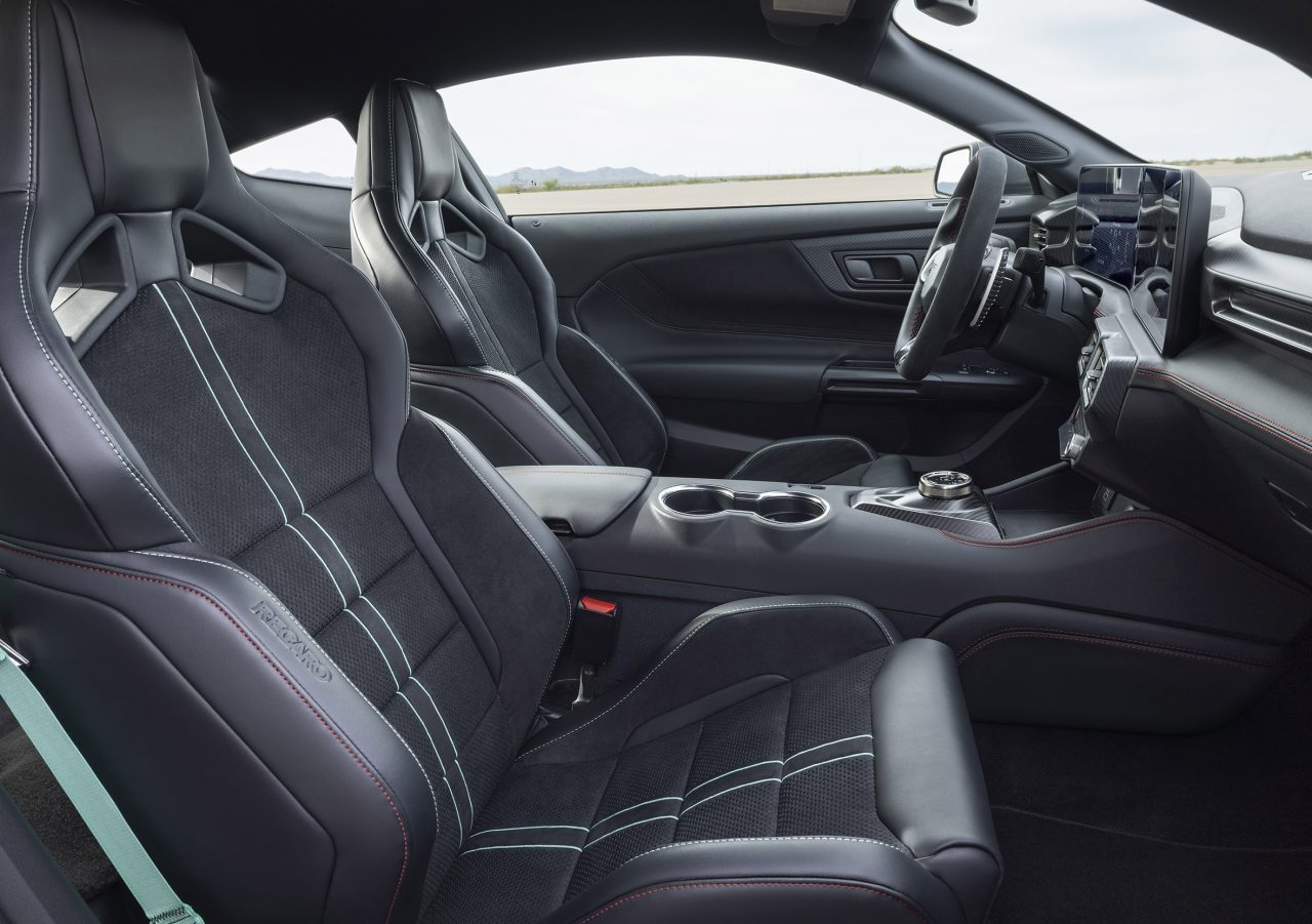 No interior, o Dark Horse SC traz volante revestido em couro e Alcantara, bancos opcionais Recaro em couro e Dinamica, além de acabamentos em fibra de carbono. O Track Pack oferece pacote Teal, com pinças de freio azul-esverdeadas, cintos personalizados e grafismos externos.