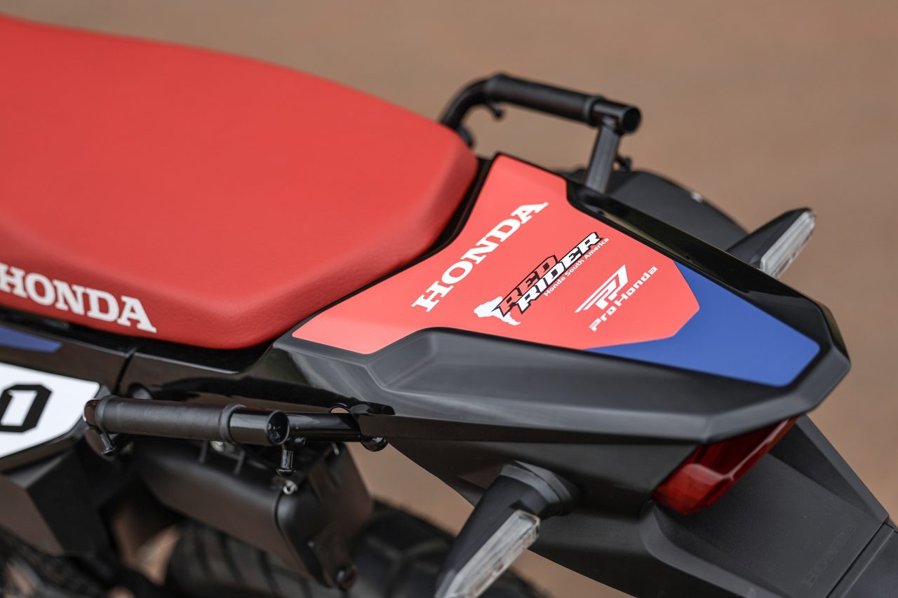 Na versão Special Edition, a cor Fighting Red é a base, acompanhada de detalhes em branco e azul, formando o clássico tripé cromático das Honda mais esportivas. O preto fosco aplicado ao guidão, rodas, chassi, suspensão dianteira, balança traseira e escapamento reforça o caráter radical. O logotipo Red Rider e a inscrição “300” emulando placas de competição completam o visual.