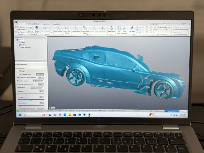 Scanner 3D: Equipamento que captura a geometria de peças e carrocerias em nuvens de pontos para modelagem digital.