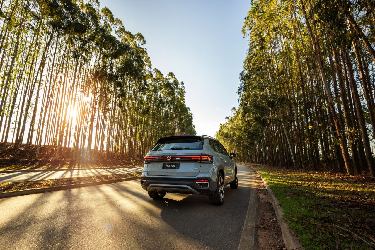 Na traseira, o Taos 2026 se torna o primeiro modelo da Volkswagen no Brasil a apresentar logotipo traseiro iluminado, recurso que vem se popularizando no mercado premium. As lanternas ganharam novo desenho e passaram a ser interligadas por uma faixa de LED que atravessa toda a largura do veículo, elemento visual que remete aos modelos elétricos da família ID. O para-choque traseiro também recebeu retoques sutis, enquanto as rodas de liga leve apresentam novos desenhos específicos para cada versão.