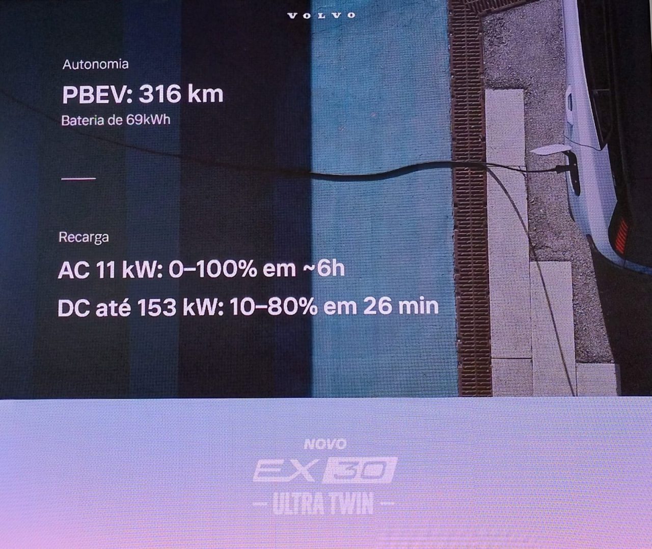 Autonomia: Representa a distância que o veículo pode percorrer com uma carga completa da bateria. O EX30 oferece até 338 km, dependendo da versão.