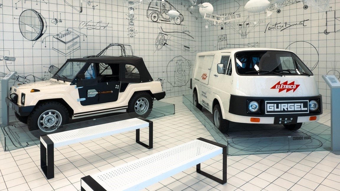 Entre os veículos expostos, o Gurgel Ipanema (1969) se destaca como o primeiro modelo da marca, com carroceria em fibra de vidro e motor Volkswagen boxer de 1.500 cm³.