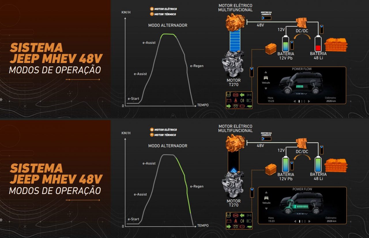 O sistema MHEV do Renegade é uma arquitetura paralela projetada para complementar o motor térmico. Ele opera em uma linha de alta eficiência de 48V, integrada ao comportamento dinâmico do veículo.