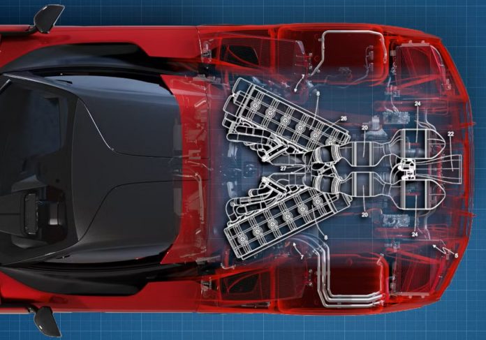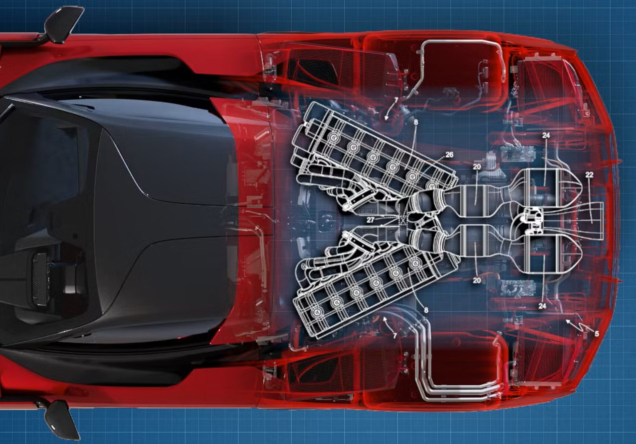 O ângulo em “V” ideal estaria entre 20 e 30 graus, podendo chegar a 45 graus dependendo da montagem. Os motores ficariam posicionados entre o motorista e as rodas traseiras, mantendo o equilíbrio típico de supercarros da Ferrari.