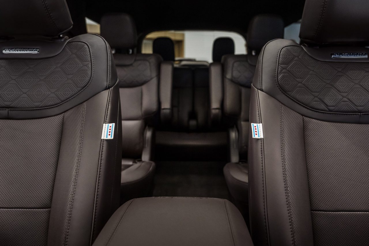 O interior recebeu atenção especial: bancos de couro com etiquetas da bandeira de Chicago, o skyline da cidade bordado no console central e um sistema de áudio adaptado para sintonizar rádios europeias. As soleiras exibem os skylines de Chicago e da Basílica de São Pedro, simbolizando a jornada do Papa até o Vaticano.