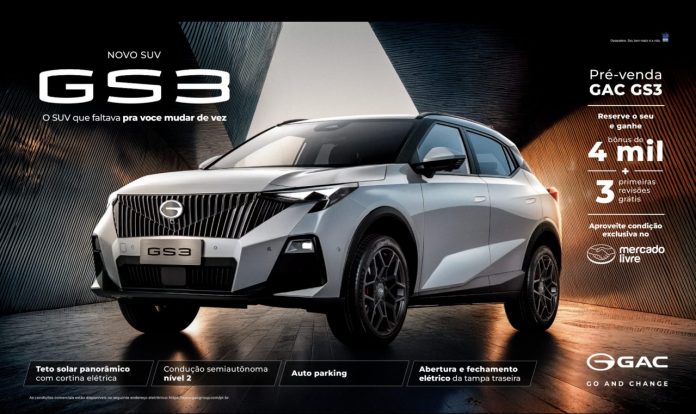 A GAC iniciou oficialmente nesta sexta-feira, 6 de março, às 16h, a pré-venda do SUV compacto GS3 no Brasil. O modelo pode ser reservado mediante sinal de R$ 4 mil, valor que será abatido na compra. A comercialização acontece exclusivamente pela página oficial da montadora no Mercado Livre, ampliando o alcance e facilitando o acesso dos consumidores.