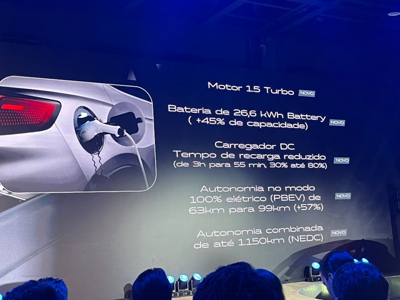 A nova bateria de 26,6 kWh representa um aumento de 45% em relação à anterior. Isso permite 99 km de autonomia elétrica segundo o Inmetro, contra os 68 km da versão passada. A autonomia total declarada pela marca é de 1.150 km.