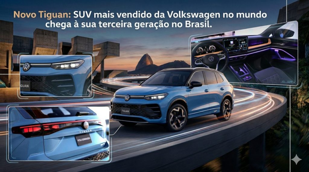 O Novo Tiguan estreia no Brasil em sua terceira geração, consolidando 17 anos de tradição no segmento de SUVs e mais de 8 milhões de unidades vendidas em 80 países. Construído sobre a plataforma MQB Evo, o modelo chega em versão única R-Line, equipado com o motor EA888 Evo5 de 272 cv e 35,7 kgfm de torque, associado à tração integral 4Motion, com preço sugerido de R$ 299.990. O SUV mais vendido da Volkswagen no mundo inaugura uma nova fase tecnológica da marca, com foco em usabilidade, customização e segurança.