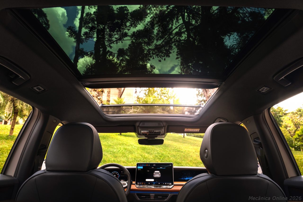 Os bancos dianteiros possuem ajuste elétrico, memória, aquecimento, ventilação e até oito opções de massagem, reforçando o conforto em viagens longas. O teto solar panorâmico e a tampa elétrica do porta-malas com função Easy Open & Close são itens de série.
