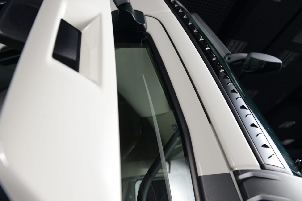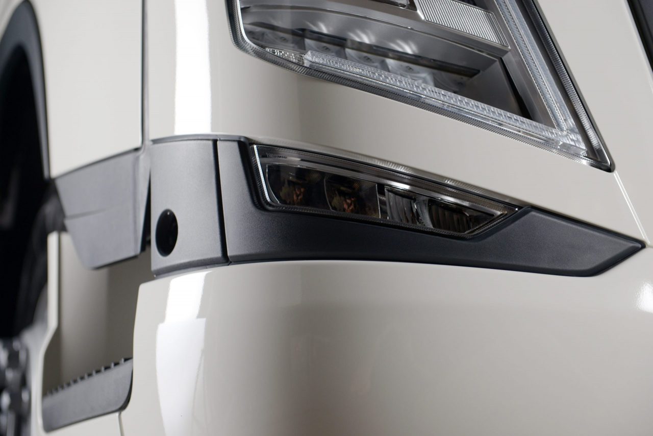 Uma das principais novidades é a instalação de aletas aerodinâmicas na coluna A, localizada na parte frontal da cabine. Essa alteração reduz a turbulência ao redor do cavalo mecânico, permitindo que o ar flua com menor resistência lateral.
