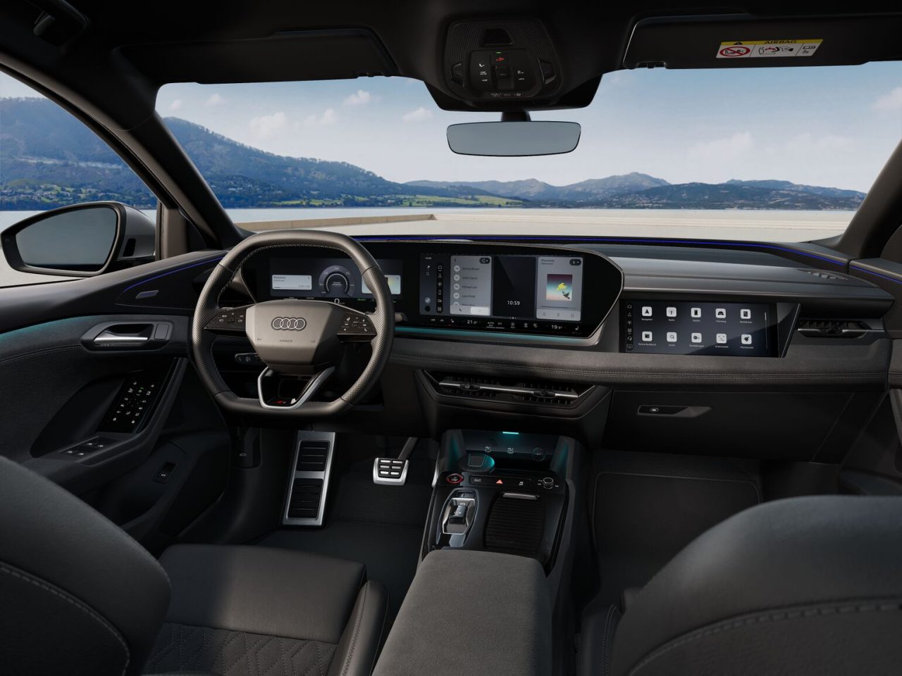 O conceito de “Palco Digital” no interior foca na ergonomia, trazendo o novo volante com botões físicos (sliders) e materiais sustentáveis em uma arquitetura de alto contraste.