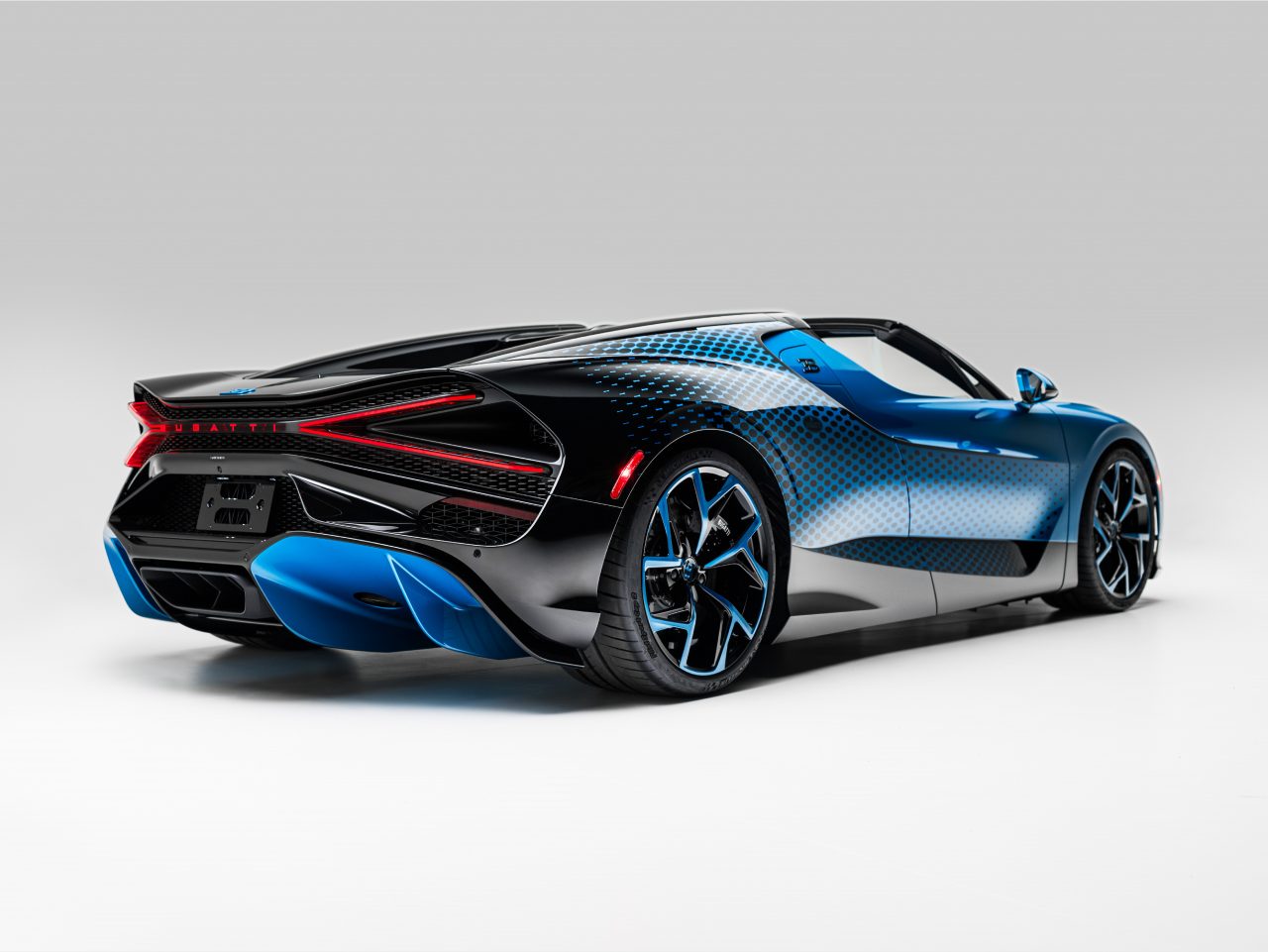 A carroceria ostenta um padrão elíptico complexo que se torna mais denso em direção à traseira, desaparecendo gradualmente nas entradas de ar do motor W16.