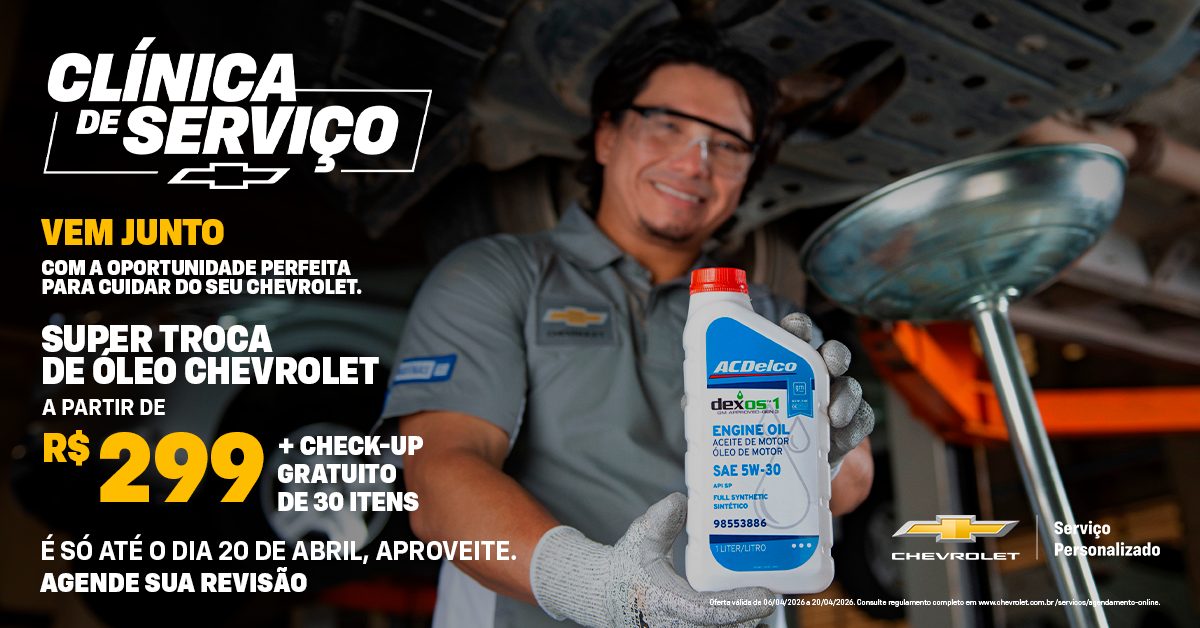 Durante o mês de abril de 2026, os proprietários de veículos da marca contam com condições especiais para manutenção preventiva. O destaque é a Super Troca de Óleo Chevrolet por apenas 299 reais, valor que inclui o uso de lubrificantes recomendados pela marca e o check-up gratuito de 30 itens vitais.