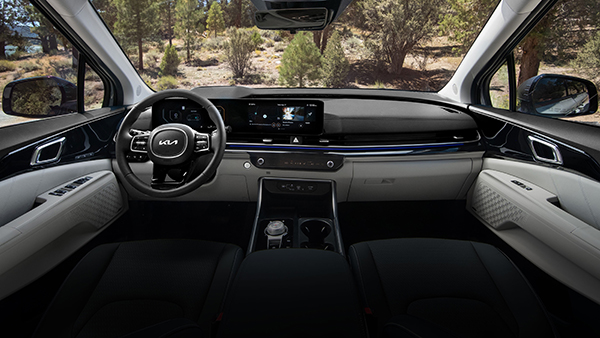 No quesito conectividade, a Carnival oferece suporte a Apple CarPlay e Android Auto sem fio e múltiplas portas USB-C espalhadas por todas as fileiras.