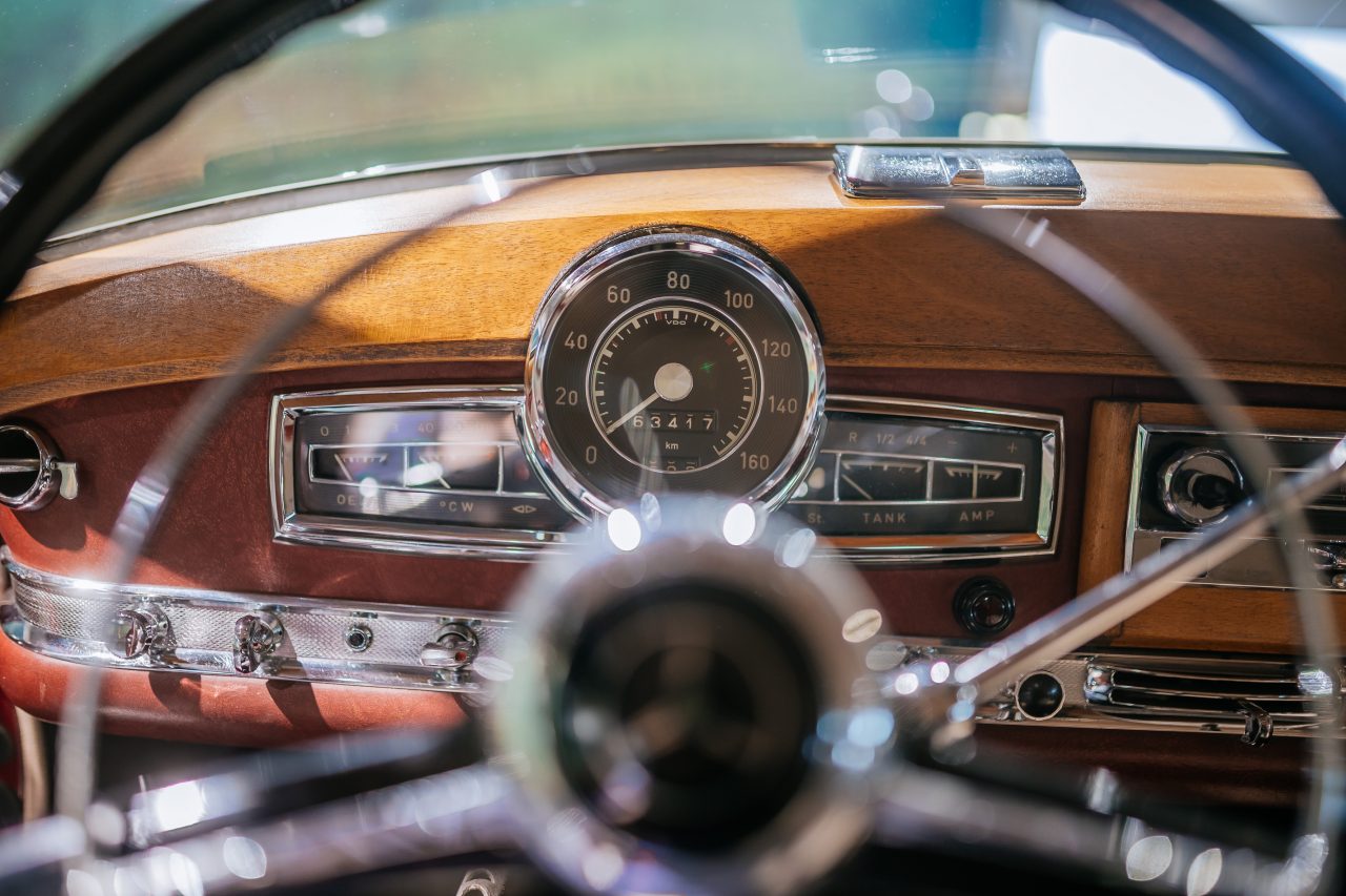 O interior é uma vitrine de artesanato clássico, com madeira aplicada no painel e contornos de janelas, além de teclas cromadas no rádio Becker Nürnberg.