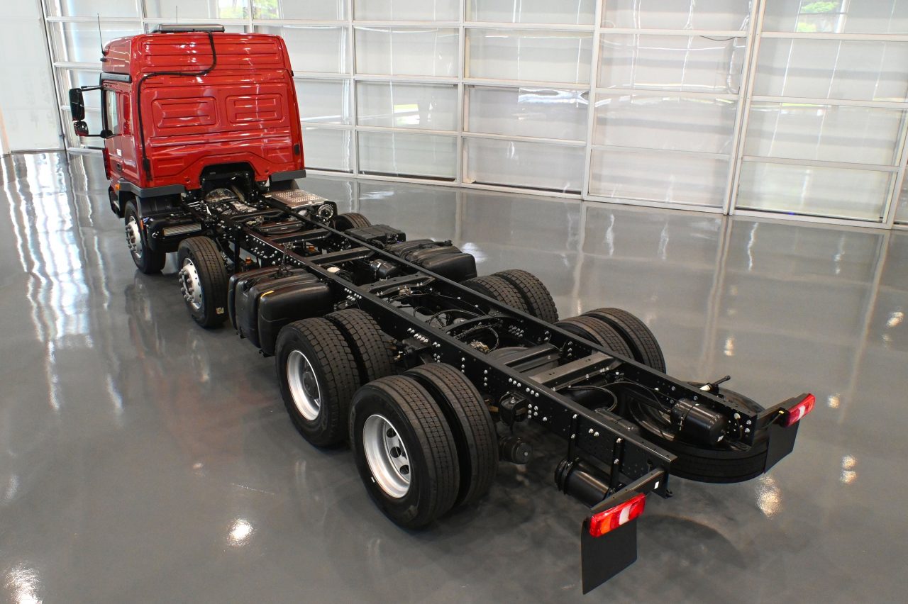 Equipado com o motor OM 926 LA de 321 cv, o modelo entrega 1.250 Nm de torque para operações de basculante e betoneira.