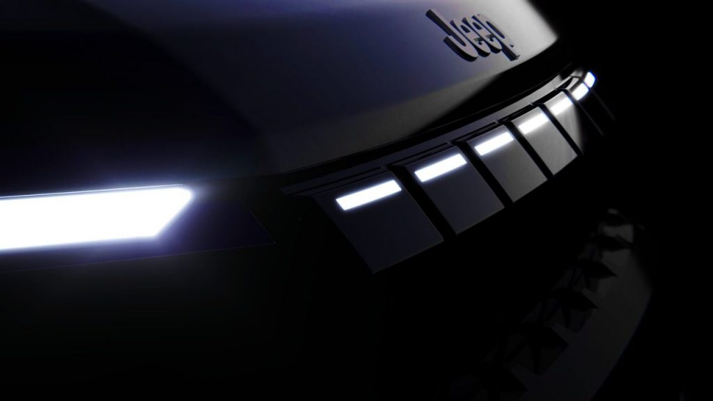 A nova grade do Jeep Avenger 2027 apresenta uma releitura moderna das sete fendas, integrando pontos de LED iluminados que reforçam a identidade digital da marca.