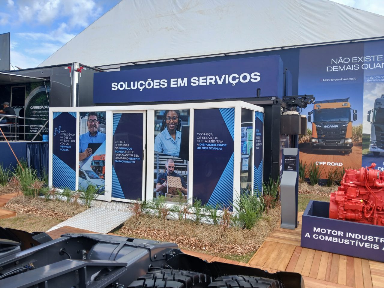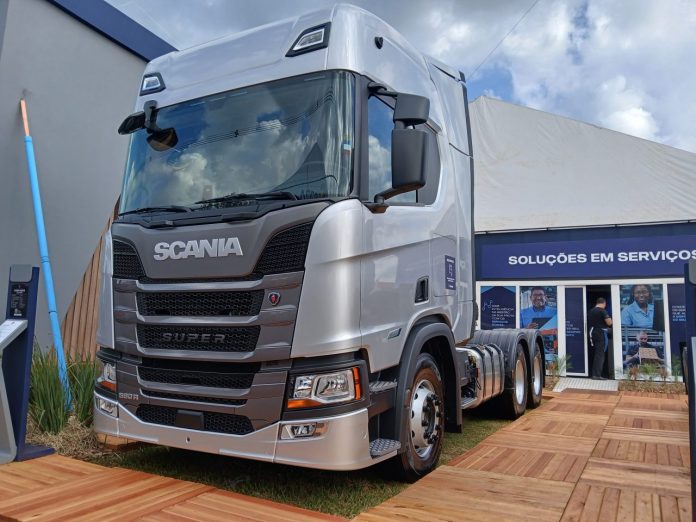 A Scania exibe em seu estande de 600 metros quadrados quatro modelos de caminhões e um motor industrial de 9 litros, todos voltados para a máxima eficiência no ciclo do agro.