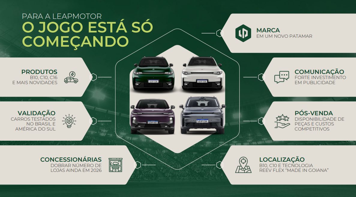 A Stellantis anunciou nesta segunda-feira (6) a nacionalização da marca Leapmotor no Brasil, utilizando o Polo Automotivo de Goiana (PE) como base produtiva. O projeto contempla a fabricação dos SUVs B10 e C10, além do desenvolvimento global da primeira tecnologia REEV Flex do mundo, unindo a expertise em engenharia brasileira com a eletrificação chinesa.